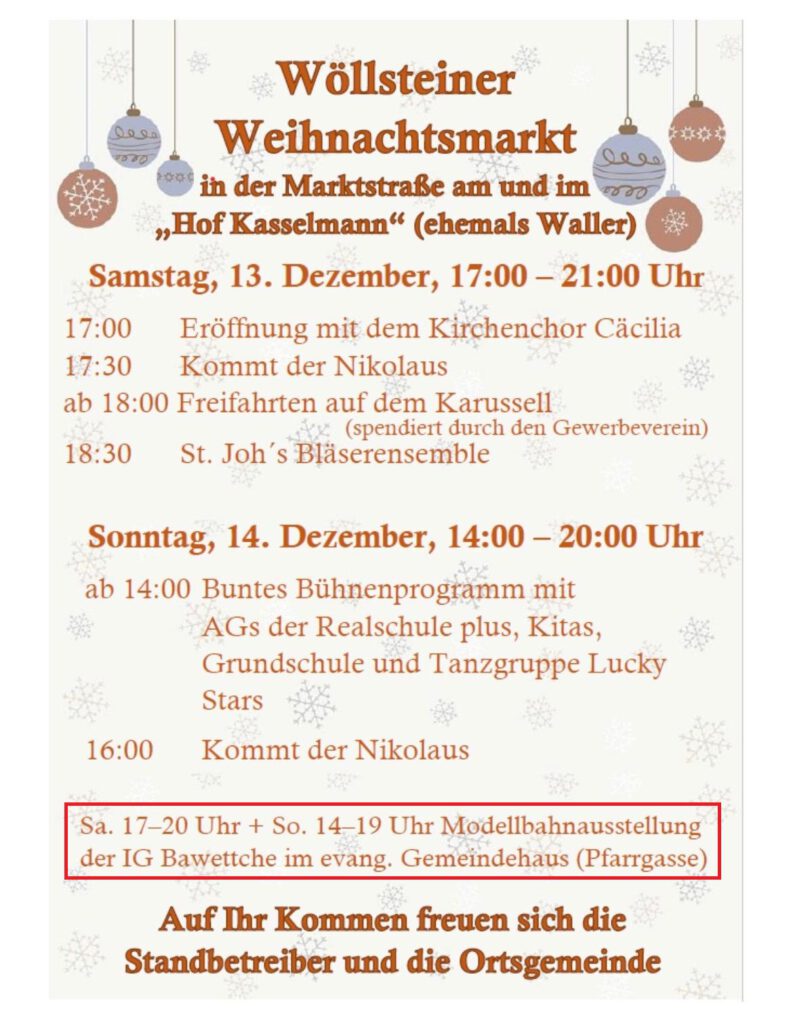 Auch in diesem Jahr nehmen wir wieder am Wöllsteiner Weihnachtsmarkt, am 3. Advent-Wochenende, mit einer Modellbahn-Ausstellung im evangelischen Gemeindehaus teil.